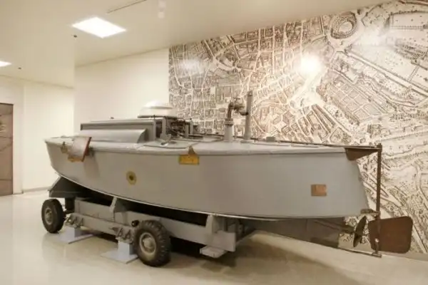 Шпионская лодка образца 1950 года. Без вооружения, она могла транспортировать двух человек, находясь в полупогруженном состоянии. Обычно на такой лодке высаживались с большого корабля и проникали на территорию, на которую обычные корабли не могли пройти из-за размеров.