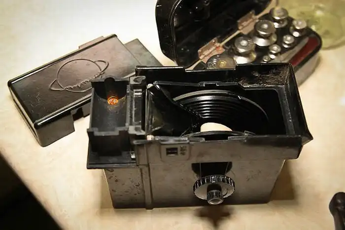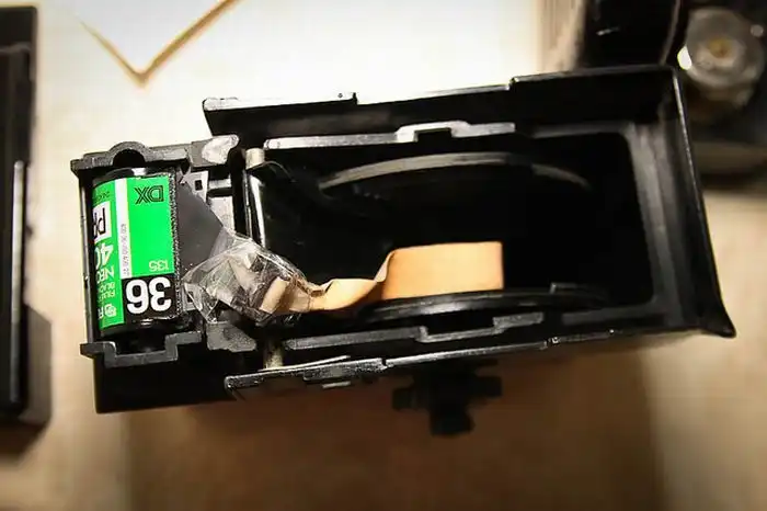 9. Заряжаем плёнку в бачок. У меня бачок в который можно заряжать плёнку на свету. Открываем - кладём катушку - фиксируем плёнку - закрываем - наматываем - отрубаем катушку специальными ножами (сбоку есть рычажок).