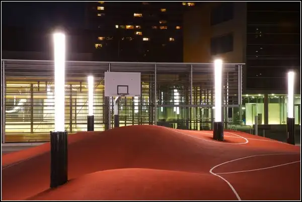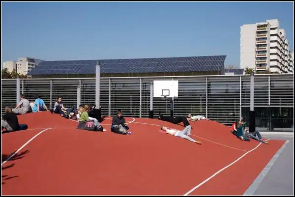 И это не ошибка проектировщиков или строителей. Так было задумано изначально. Inges Idee создавали не спортивную площадку для игры в баскетбол, а общественное пространство, стилизованное под нее. Здесь можно посидеть (или полежать) отдохнуть между занятиями, подготовиться к экзамену или просто провести время в приятной компании с друзьями. Причем, как днем, так и ночью (площадка подсвечивается).
