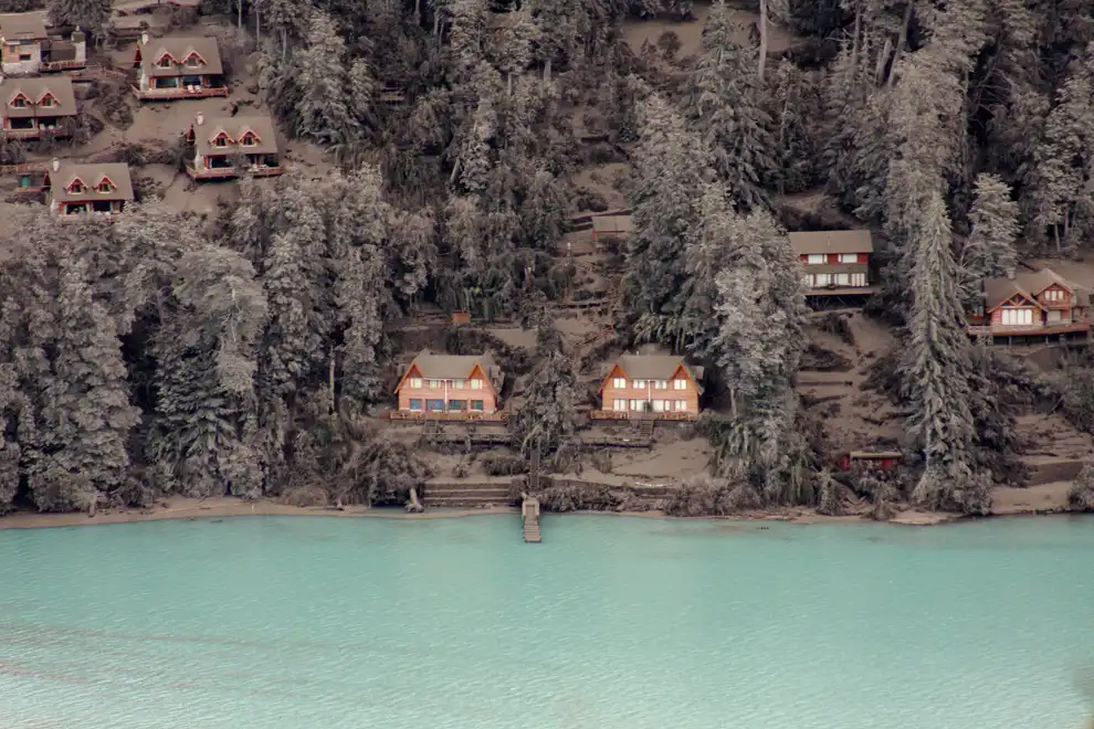 Покрытые пеплом дома на берегу озера Науэл Хуапи в южной Аргентине. Начавшийся извергаться около двух недель вулкан стал менее активным. Это позволит четырем тысячам людей вернуться в свои дома.