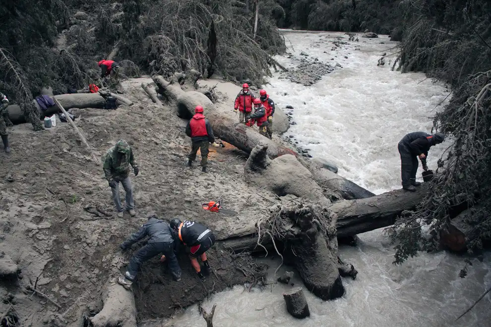 Пограничная полиция и спасатели Аргентины убирают пепел из реки, ведущей к озеру, чтобы избежать затора в Вилла ЛА Ангостура.