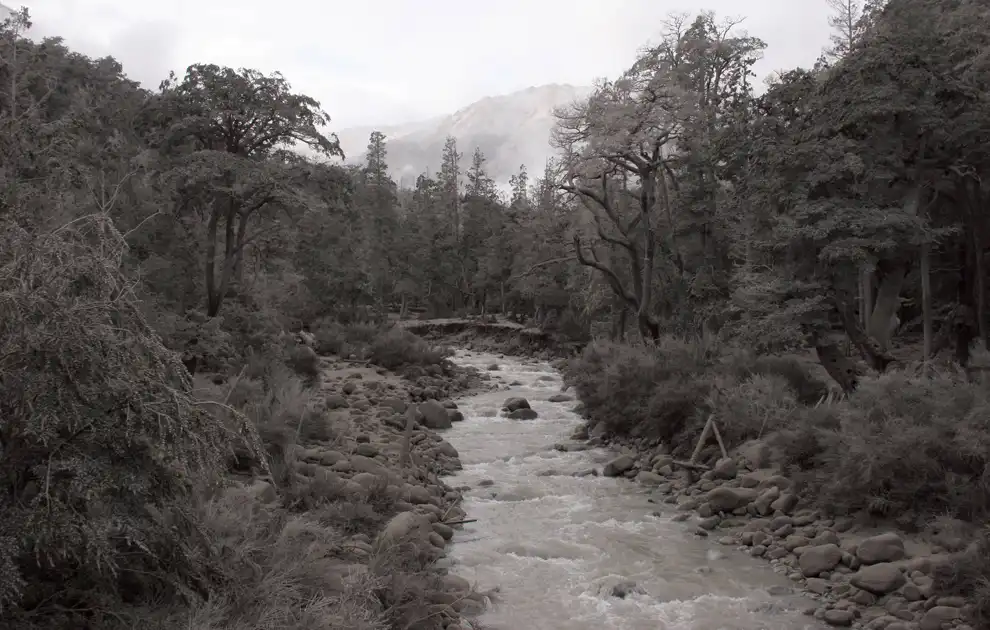 Река Ранхентуко под слоем пепла от вулкана Пуйеуэ на окраине Вилла Ла Ангостура в 1600 км к юго-западу от Буэнос-Айреса.