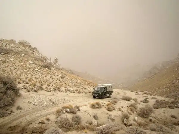 Автомобиль аргентинской пограничной полиции на покрытой пеплом дороге в Вилла Лланкуин.
