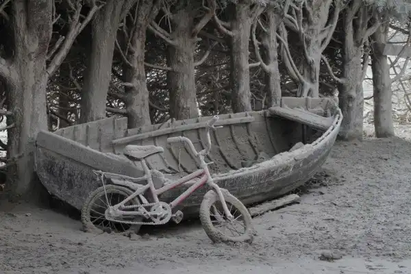 Покрытая пеплом лодка и велосипед в Вилла Лланкуин.