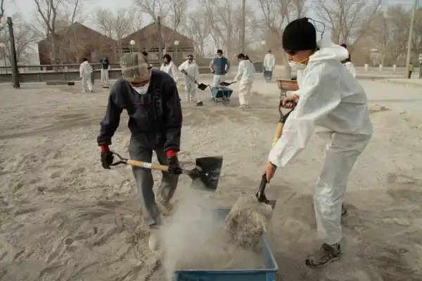 Добровольцы убирают вулканический пепел в Ингениеро Джакобаччи.