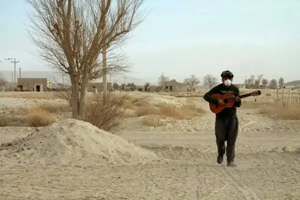 16-летний ученик отделения гитары в музыкальной школе по имени Данте с гитарой, после урока, на покрытых пеплом улицах в Ингениеро Джакобаччи.
