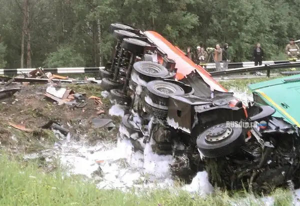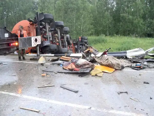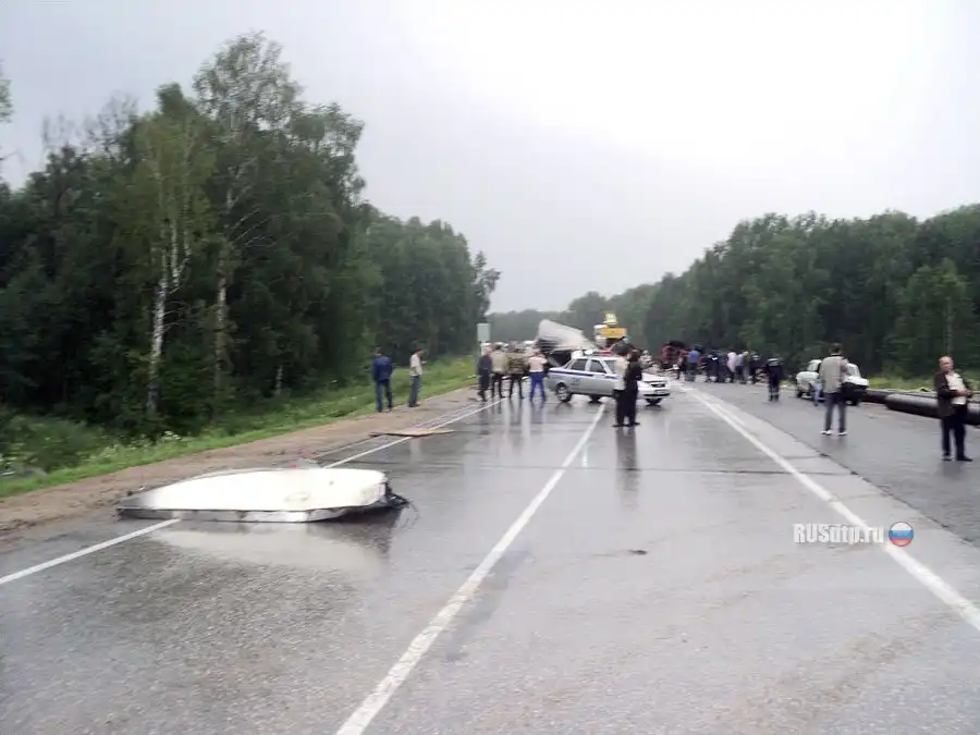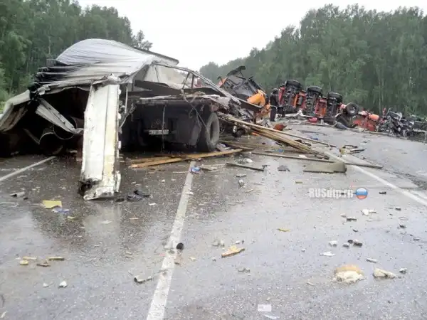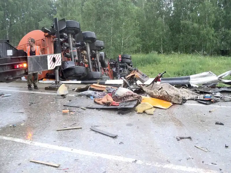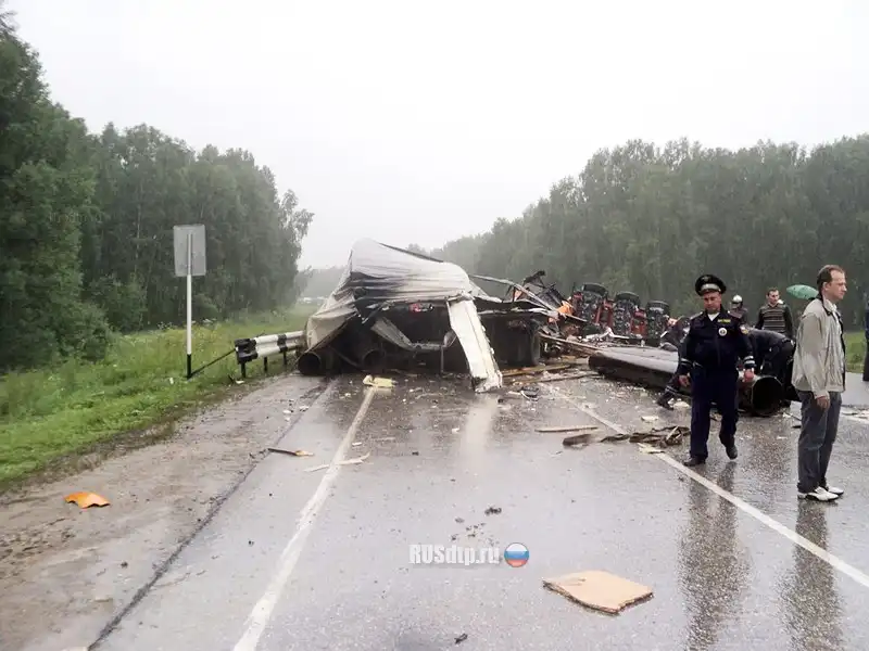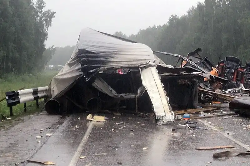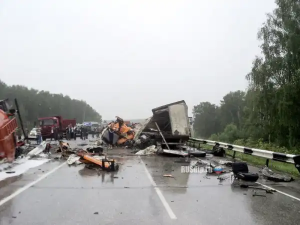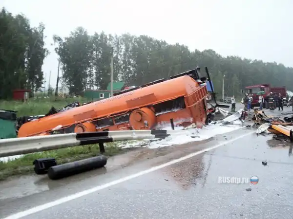 12 июля около 18:05 в Новосибирской области на 95 км трассы М-53 в Мошковском районе произошла крупная авария. 46-летний водитель тягача «Freightliner», перевозивший стальные трубы, при обгоне столкнулся с попутным автомобилем «Тойота Калдина» под управлением 28-летнего водителя, после чего фуру выбросило на встречную полосу под бензовоз «МАЗ», который перевозил 23 тонны нефтепродуктов.