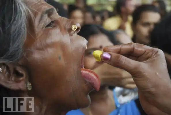 9. Более 100 лет назад семейство Батини Гауд из Индии разработали собственную “медицинскую” систему, которая включает в себя глотание сырой рыбы, длиной два-три дюйма (5-7 см), нафаршированной желтой травяной пастой. Рыбка называется “муррель”. Секрет травяной пасты передается из поколения в поколение и известен только членам семьи. По словам лекарей, пациент навсегда излечивается от астмы, если глотает живую рыбу три года подряд и строго соблюдает диету, предписываемую знахарями. На фотографии – пациент глотает живую рыбу в Гайдерабаде.