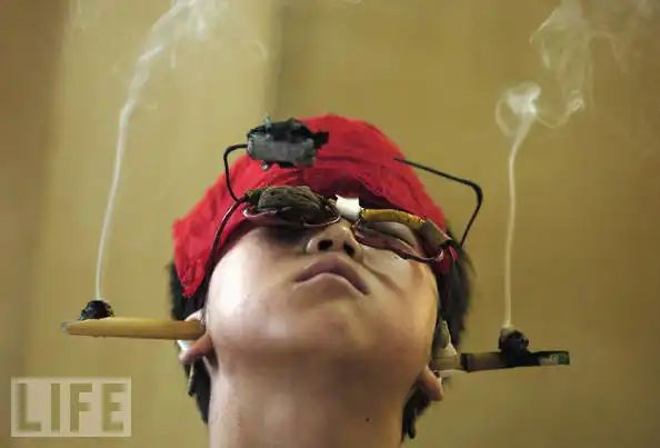 10. Пациент больницы в городе Цзинань, столице провинции Шаньдун в Китае, получает традиционное китайское лечение паралича лицевого нерва. При лечении используется грецкий орех, помещенный над глазом, и прижигание, или сжигание сухих листьев чернобыльник). Прижигание является чрезвычайно важным в традиционной китайской медицине, так как оно, как полагают, стимулирует кровообращение и циркуляцию крови и других жидкостей в организме.