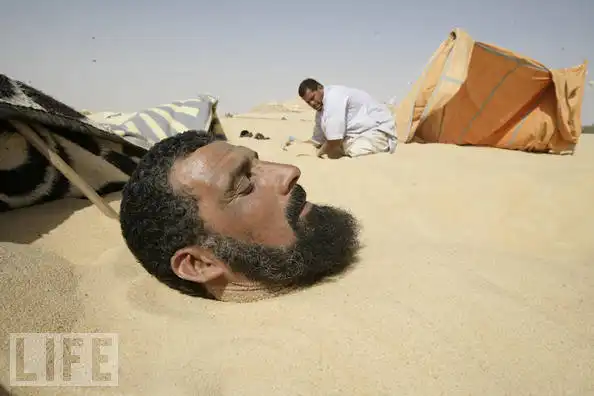 12. Клиника, расположенная в пустыне Сахаре в Египте, предлагает традиционное лечение ревматизма: закапывание нижней части тела в горячий песок. На этой фотографии, сделанной в 1985году, пациенты клиник используют зонтики для защиты лица от солнца во время прохождения лечения.