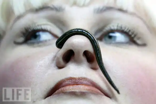 2. Гирудотерапия, или использование пиявки в медицинских целях для кровопускания, началось две с половиной тысячи лет назад. Сегодня пиявки вновь становятся популярны благодаря исследованиям, которые сконцентрированы на болеутоляющих свойствах химических веществ, которые проникают в организм при укусах пиявок. Клинические испытания показали, что пиявки являются эффективными для лечения проявлений артрита и других болезней. Это не означает, однако, что вы можете просто так купить пакет пиявок в местной аптеке. Одним из источников медицинских пиявок является Международный центр медицинской пиявки в России (IMLC), который поставляет этих существ в специализированные клиники по всему миру. На фотографии сотрудник IMLC демонстрирует свой продукт.