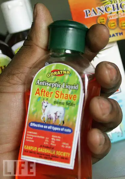 8. В Индии огромной популярностью пользуются продукты, сделанные из коровьей мочи и навоза. Считается, что они могут помочь вам избавится от таких болезней как рак, расстройства нервной системы и другие. На фотографии – мужчина держит лосьон после бритья, изготовленный на основе коровьей мочи. Предполагается, кстати, что это же средство должно применяться для дезинфекции и лечения порезов и ран.