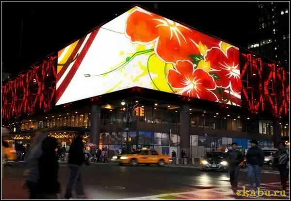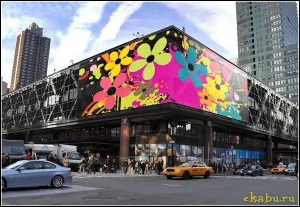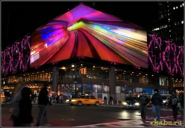 Этот огромный светодиодный угловой экран был размещен на здании автовокзала Port Authority Bus Terminal, расположенном на углу 42-й улицы и 8-го авеню на Манхеттене. Само это пятиэтажное здание было построено еще в 1970-х годах, и с тех пор считалось одним из самых уродливых сооружений в Нью-Йорке и Соединенных Штатах Америки вообще. Но после его модернизации оно наверняка лишится этого статуса.