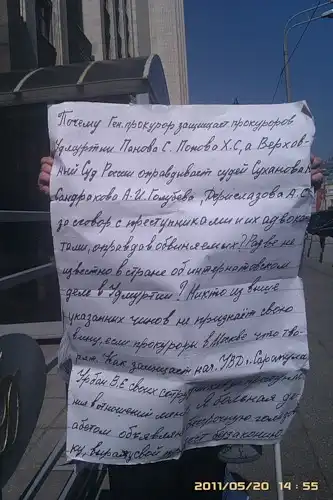 Как я понял с ее слов, у неё убили сына. По всей видимости убийца из партии жуликов и воров. Отмазали, у женщины не было даже адвоката. Прокуратура, милиция, суд, администрация президента. Все кладут на неё прибор. И правозащитник Лукин и депутаты ГД в полном составе и все СМИ.
