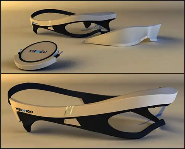 Нистагм - резкие непроизвольные движения глаза, наблюдающего за движущимися объектами. Именно благодаря нистагму и сопутствующему головокружению пассажиры иной раз высовываются с головой из окна поезда и издают странные звуки. Чтобы не тошнило в поездах, нужно научиться раскрывать в себе третий глаз - например, такой, как очки Vertigo дизайнеров Mike Neumann и Mirko Gabschuss. Закрывая два обычных глаза специальными очками, и включив третий - камеру - можно плоностью подавить нистагм и одолеть головокружение с тошнотой.