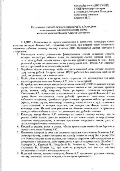 К Вашему вниманию представлены копии оригинальной жалобы сотрудников ДПС.Ранее данная жалоба подавалась в управление края УВД - там её посчитали нужным замять, точнее её просто порвали. Сотрудники ДПС просят помощи - дать огласку данному документу поскольку начальство в крае услышать их не хочет.