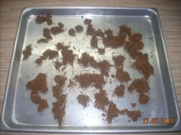 Табак, который продается в магазине, слишком крепкий для кальянной смеси, поэтому часть крепости нужно удалить. Делается это так. Часть табака (в моем случае, это 2/3 всего объёма, кому надо смесь покрепче, берете меньшую часть, кому послабее - берете больше) перекладывается в отдельную ёмкость.