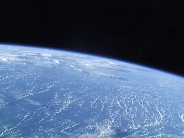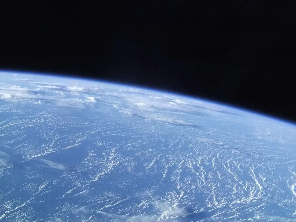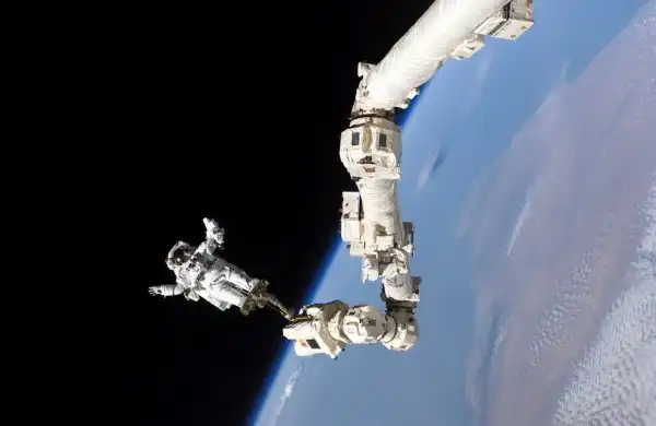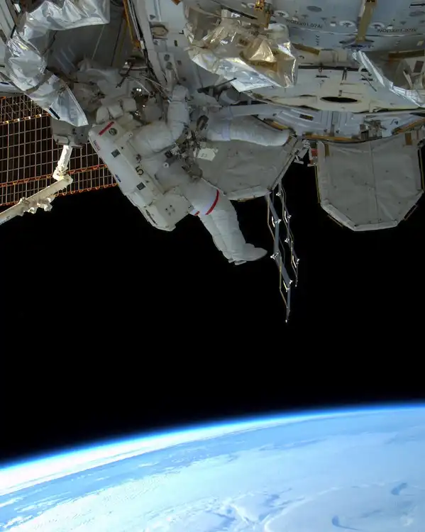 Астронавт Клэй Андерсон на фоне черного космоса и горизонта Земли 15 августа 2007 года: