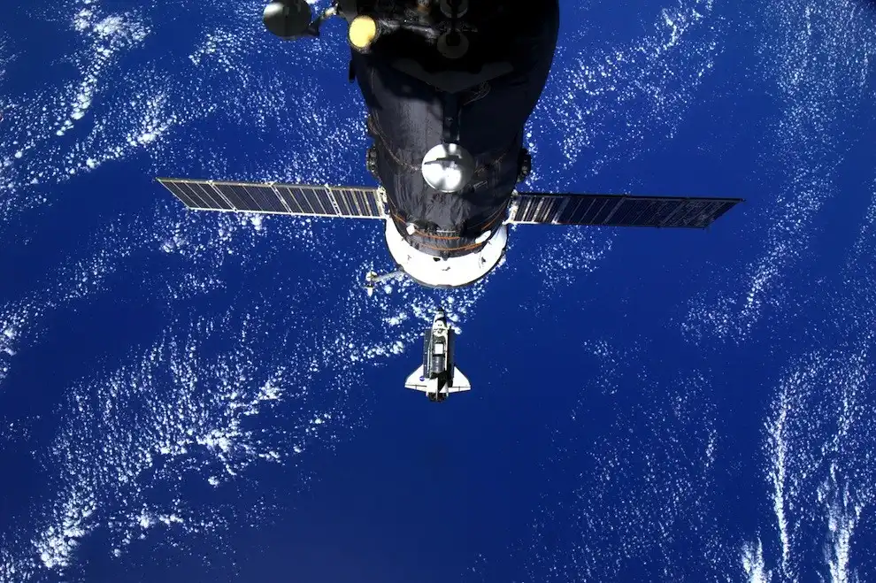 Космический шаттл «Discovery» приближается к Международной космической станции на фоне Земли: