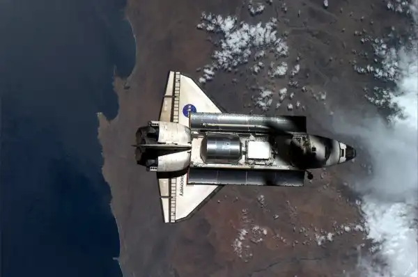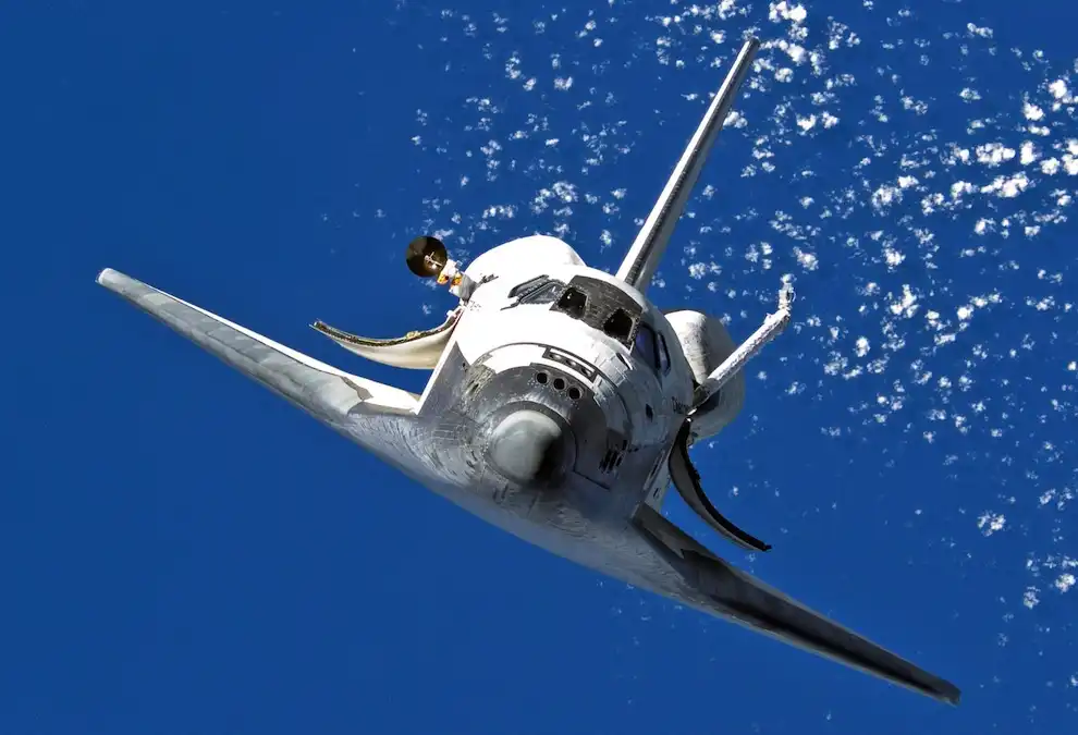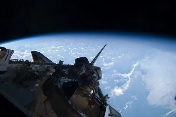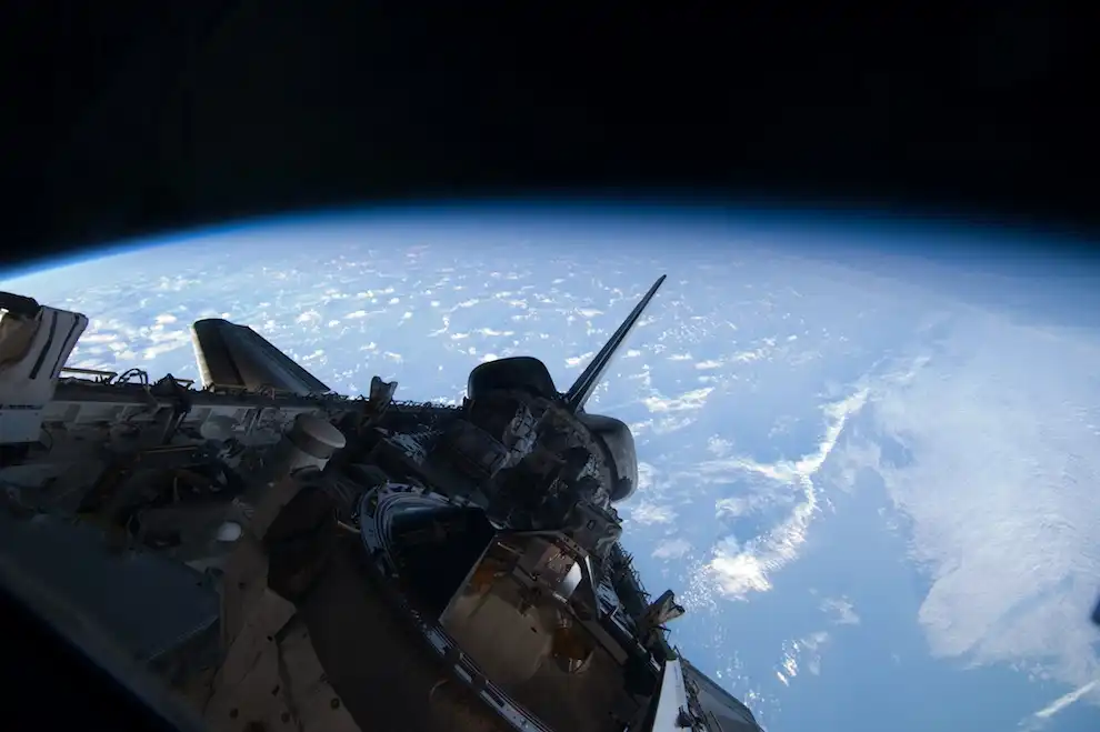 Часть грузового отсека шаттла «Atlantis», а также его вертикальный стабилизатор, орбитальная система манипулирования и стыковочный механизм на фоне черного космоса и голубой Земли: