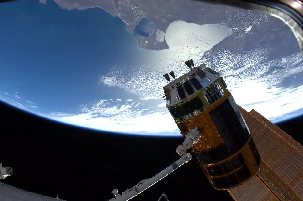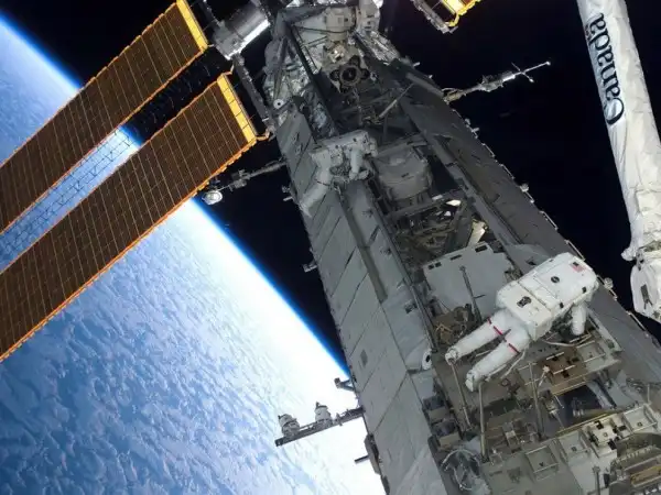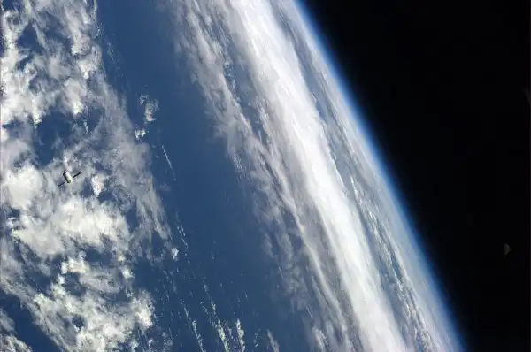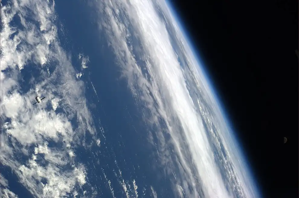 Тень от удаляющегося шаттла «Endeavour» на Международной космической станции на фоне голубой Земли 19 августа 2007 года: