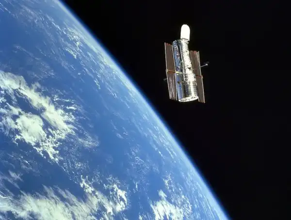 Космический телескоп «Хаббл» над Землей после отсоединения от шаттла «Discovery» в конце успешной миссии по техобслуживанию в 1999 году: