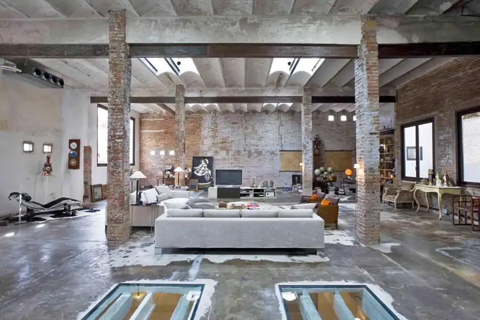 Классический для такого рода помещений интерьер с гордо представленными напоказ кирпичными стенами и высокими потолками тут сочетается с легкой светлой гаммой оформления определенных комнат.