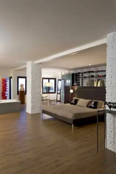 Общая площадь лофта составляет 800 кв.м. Апартаменты имеют треугольную форму и разделены на два уровня, каждый из которых оформлен по-своему.