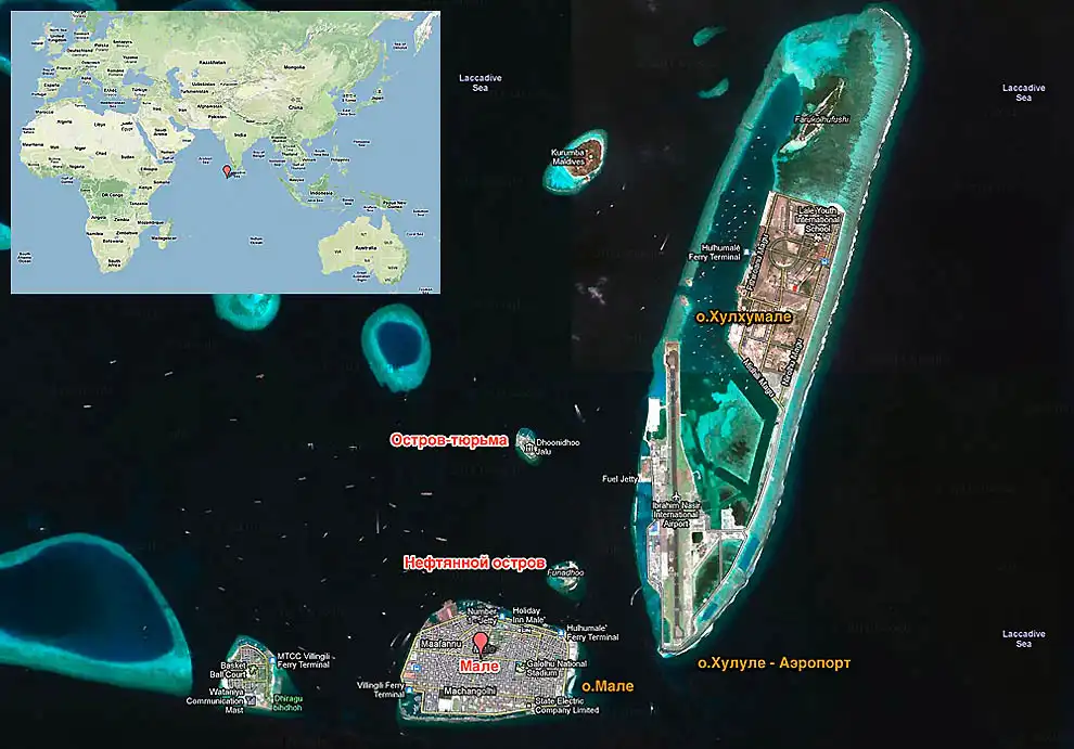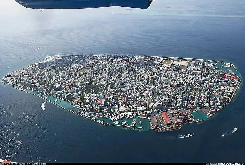 Мальдивы, официальное название Мальдивская Республика — государство в Южной Азии, располагающееся на группе атоллов в Индийском океане, находящихся к югу от Индии. Тут все размещено очень компактно... Мале, столица Мальдив, состоит из 5 районов, четыре из которых расположены на острове Мале, а пятый — на острове Вилингиле. Население - 100 тыс. человек. Это один их самых густонаселенных городов мира по соотношению количества жителей к общей площади: