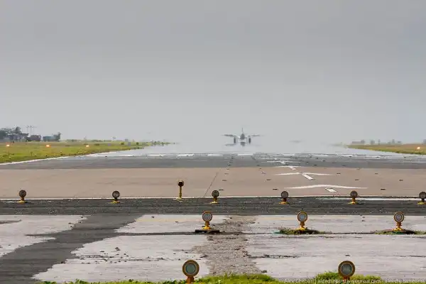 Дорога идет по периметру острова у края взлетно-посадочной полосы и при взлете-посадке самолетов проезд перекрывается: