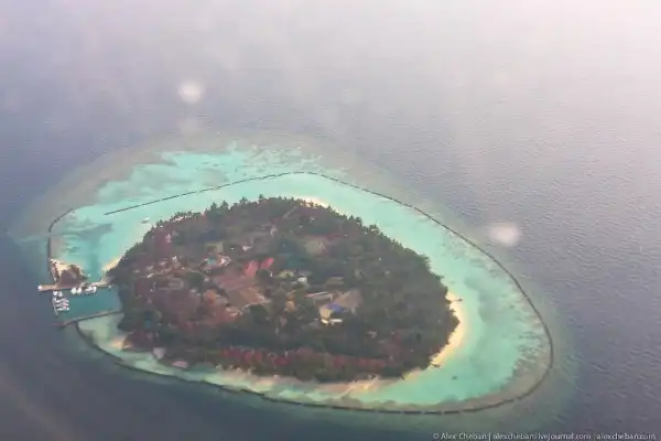 дивах"... да, не был, но отлично себе представляю, что заплатив достаточно много денеге я получу тот же белоснежный пляж с колючим дном из битых кораллов, банальные пальмы, палящее солнце, скучный бассейн, сомнительный снорклинг в виде хоть какого-нибудь развлечения. Остров маленький, на нем нет ничего кроме белого песка, пальм и бирюзового моря. А друзья будут охать потом... "ты был на Мальдивах" )) В общем мой итог такой - мир настолько интересный и разнообразный, что пробовать все стоит, но вот боготворить раскрученный бренд "райских мальдив", врядли. Мальдвы сверху красиво снять не удалось, так как вылет был вечерний и солнце уже было достаточно низко для хорошей аэрофотосъемки: