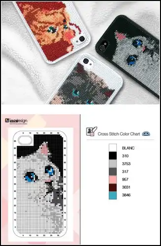 В этот набор, помимо, собственно, чехла, входят иголка и несколько катушек ниток разных цветов, а также книжечка с инструкциями по вышивке крестиком и набор стандартных рисунков с весьма популярными изображениями (котята, видеоигры и прочая поп-культура).