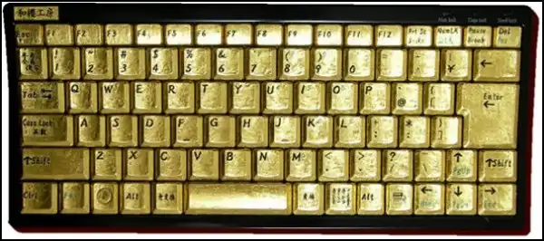 И вот, пожалуй, самый доступный для любителей чистого золота предмет: позолоченная клавиатура. Стоит она только 271 доллар, или 28.875 иен. Такие клавиатуры делает японская фирма Wazakura Koubou.