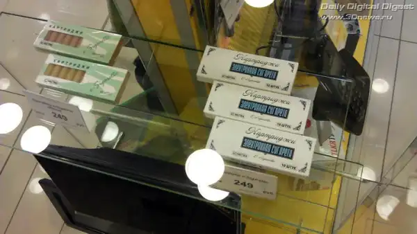 В ассортименте «Евросети» есть даже электронные сигареты. Правда, их самих уже разобрали и сейчас в наличии только картриджи с двумя вкусами