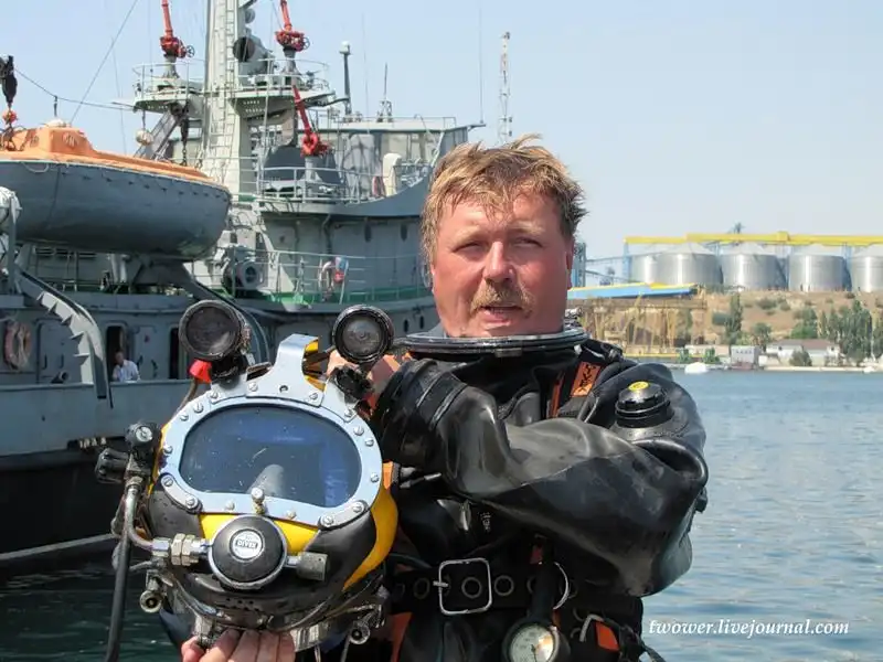 Водолаз с подводным телевизионным комплексом "Циклоп" спускается под воду