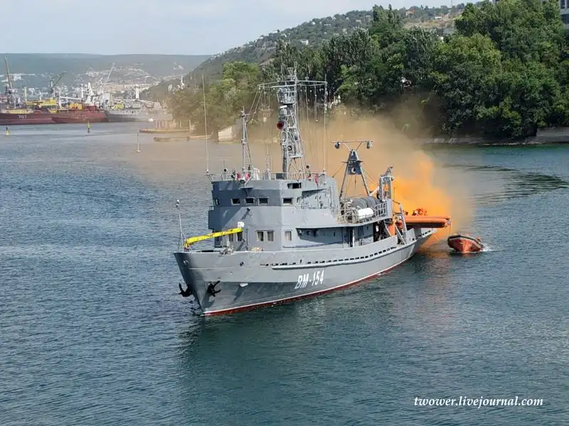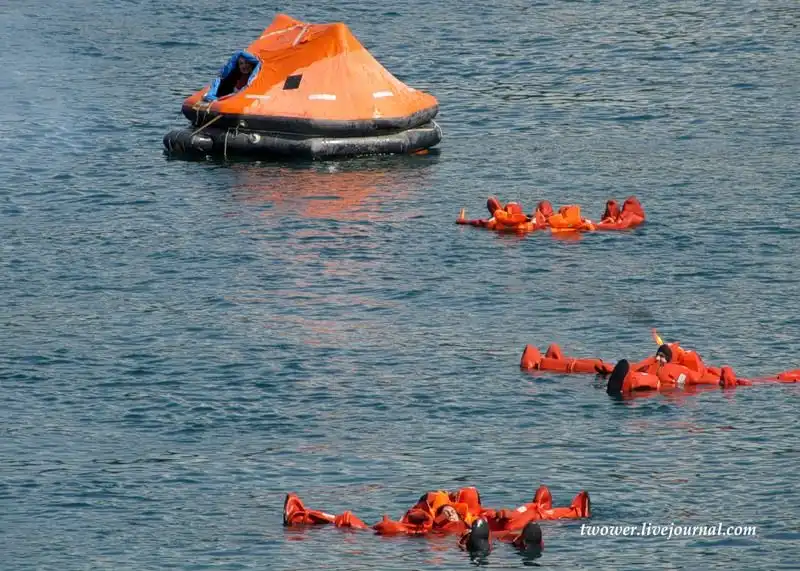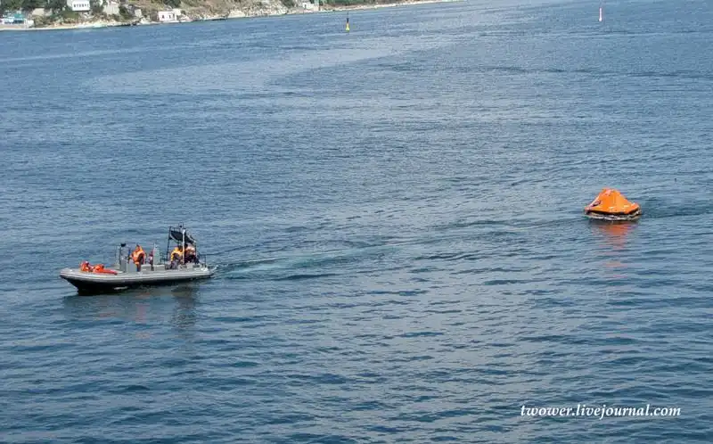 На примере морского водолазного судна пр.535 ВМ-154 продемонстрировали сначала эвакуацию, а затем и спасение экипажа