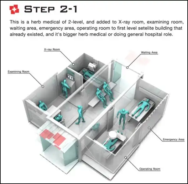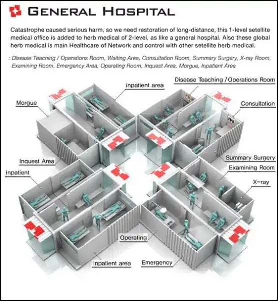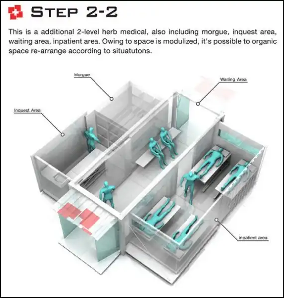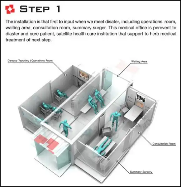 Опустившись на поверхность, контейнер очень быстро раскладывается в полевой госпиталь с несколькими комнатами.