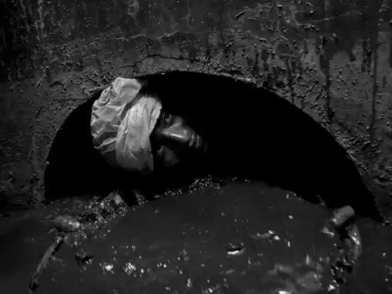 2) Уззал Дас чистит сточную трубу. Он и ещё около 5 с половиной миллионов мусорщиков из касты неприкасаемых остались в Бангладеше ещё с колониальных времён. Их обязанности всё те же - делать "нечистую" работу , такую как кремация умерших, чистка сортиров, удаление мёртвых животных с городских улиц, прочищение сточных канав и канализации, и т.п.