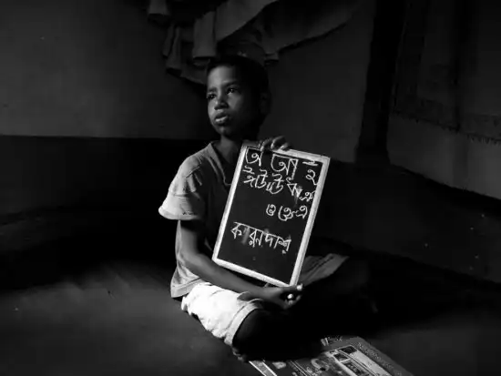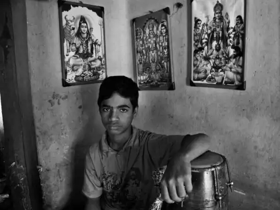 14) Кваран Дас, сын Бадала Даса, ходит во второй класс школы. Уровень образованности среди далитов крайне низкий. Большинство детей хариджан уходят из школы, не закончив среднего образования, чтобы зарабатывать деньги для своей семьи.