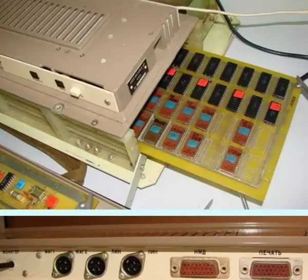 С обратной стороны видим разъемы. "МАГ1" и "МАГ2" - магнитофонные выходы. Зачем два - непонятно. Наверно, разработчики сами не до конца понимали, зачем они нужны в таком количестве, и поэтому один из них закрыли загрушкой. Так что первый недоступен. Предлагают пользоваться вторым. Есть также два разъема "линия"(?), а также "печать" и "НМД". Последний, как я понял, это накопитель на магнитном диске (дисковод). Однако, внутри нет никаких плат с его поддержкой. Как использовать - непонятно.