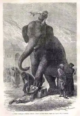 В течении нескольких веков эта казнь практиковалась в Индии и Индокитае. Слон очень легко поддается тренировке и научить его затаптывать своими громадными ногами провинившуюся жертву дело нескольких дней