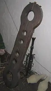 Хомут представляет из себя доску от 50 до 80 см. в длину, от 30 до 50 см. в ширину и 10 – 15 см. в толщину. В середине хомута сделаны два отверстия для ног.