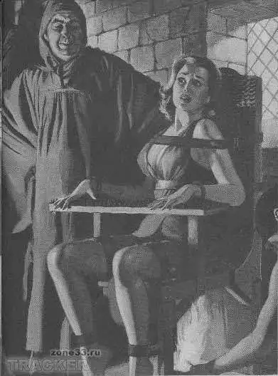 1. С обеих сторон рамы и в «чепце” были просверлены отверстия, в каждое из них продевались веревки. Первая из них затягивалась на лбу пытаемого, последняя связывала большие пальцы ног. Как правило, веревок было тринадцать, но для особенно упорных число их увеличивали.