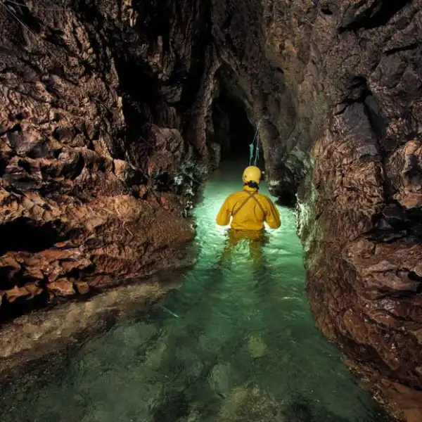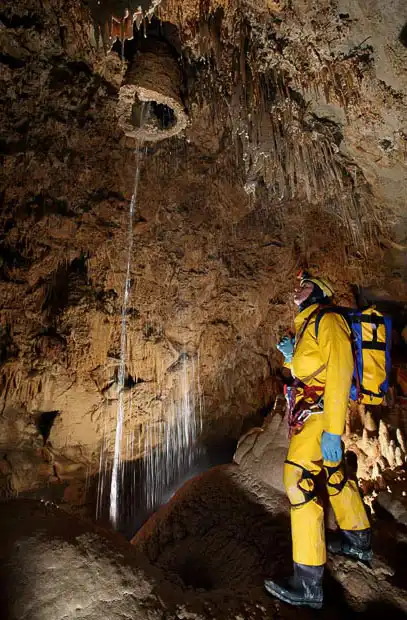 На фото: пещерный исследователь рассматривает необычное формирование внутри пещеры, которое носит название Огромный Каскад.