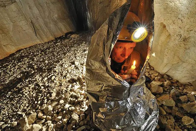 Один из спелеологов пытается согреться с помощью сохраняющего тепло одеяла и свечи.