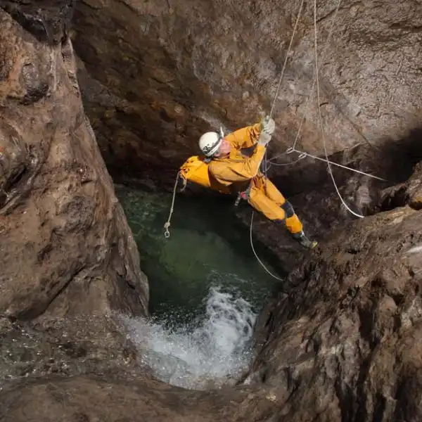 Исследователь пещер натягивает веревки во время прохождения каскада.
