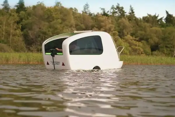 В Sealander Amphibious хорошо путешествовать! Вместо того, чтобы сидеть во время поездки в машине, можно сидеть внутри этого небольшого мобильного домика. Тем более, что стены его сделаны, преимущественно, из стекла! И из этих больших окон можно будет наслаждаться окружающими пейзажами, мимо которых двигается ваш небольшой караван.