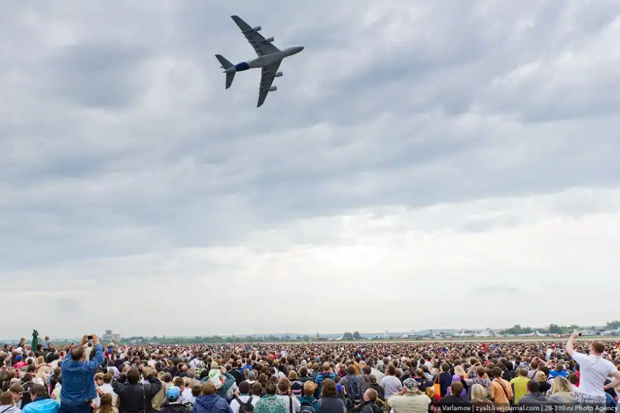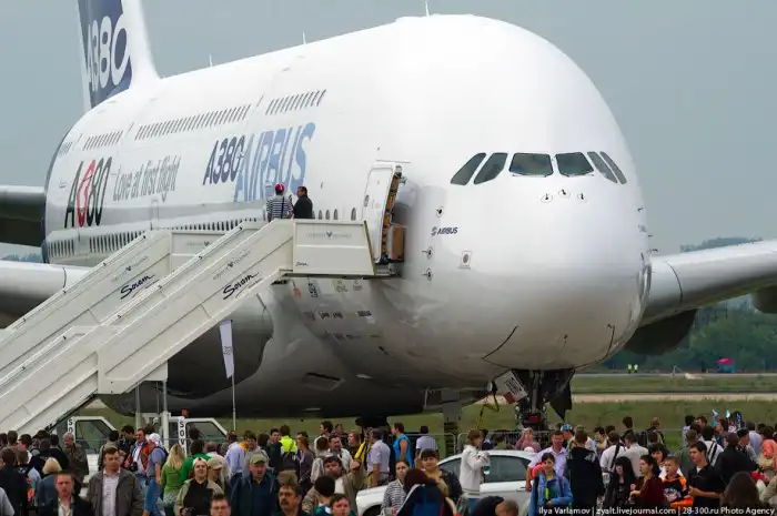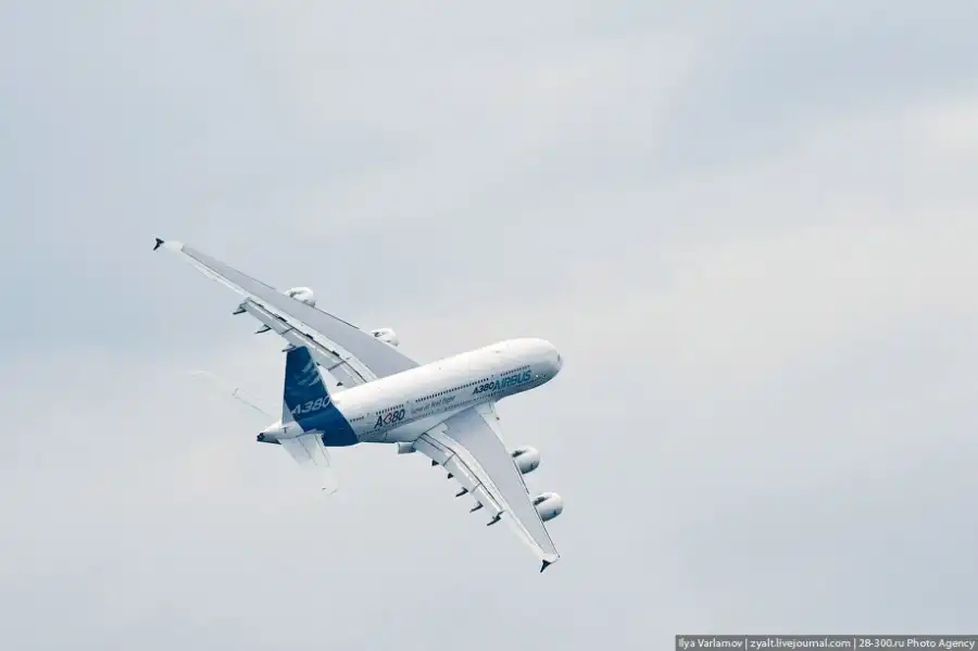 Airbus А380 — широкофюзеляжный двухпалубный пассажирский самолёт — самый крупный серийный авиалайнер в мире. Его вместимость может доходить до 853 пассажиров в одноклассовой конфигурации, это значит, что он легко может перевезти всех учеников обычной московской школы или всех жителей поселка Высокий Яр. Самолет может совершать беспосадочные перелёты на расстояние до 15 400 км – это значит, что можно из Москвы в Сидней теперь лететь без пересадок. На разработку А380 ушло около 10 лет, стоимость всей программы — около 12 млрд евро. Airbus утверждает, что для возмещения затрат корпорации необходимо продать 420 самолётов.