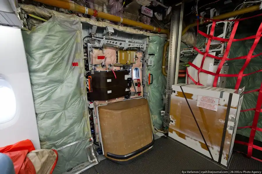 В самолете есть маленький лифт, для подъема и спуска тележек (дверца слева кадра).