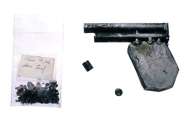 Дробовик сделанный из железных столбиков кровати, спичечные головки вместо пороха. Работал от двух батареек АА